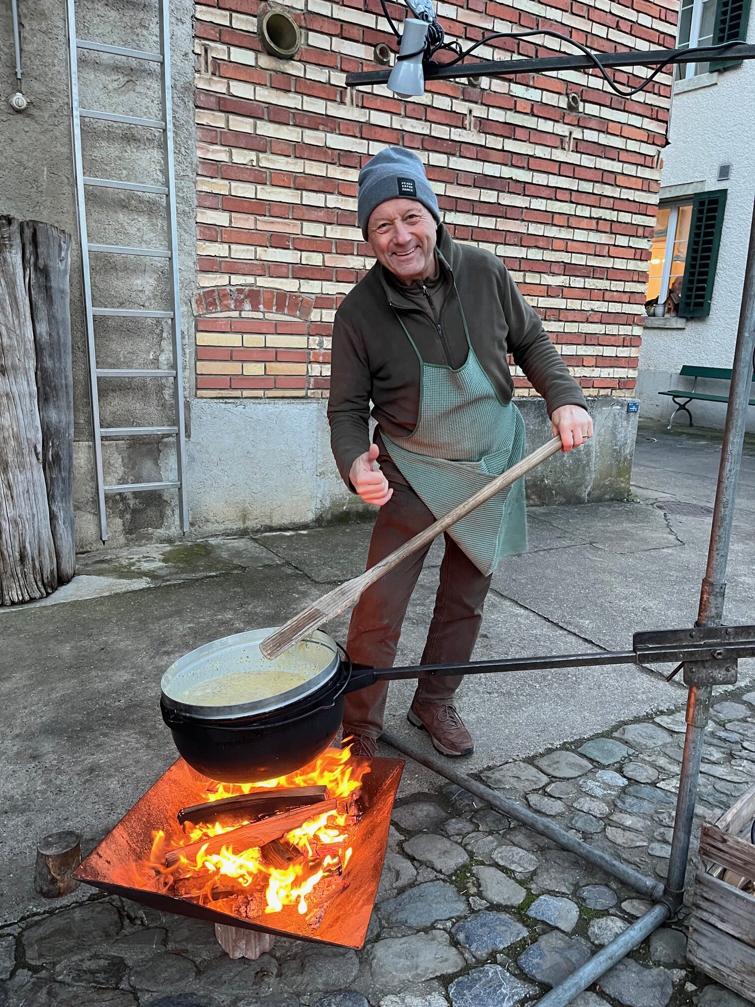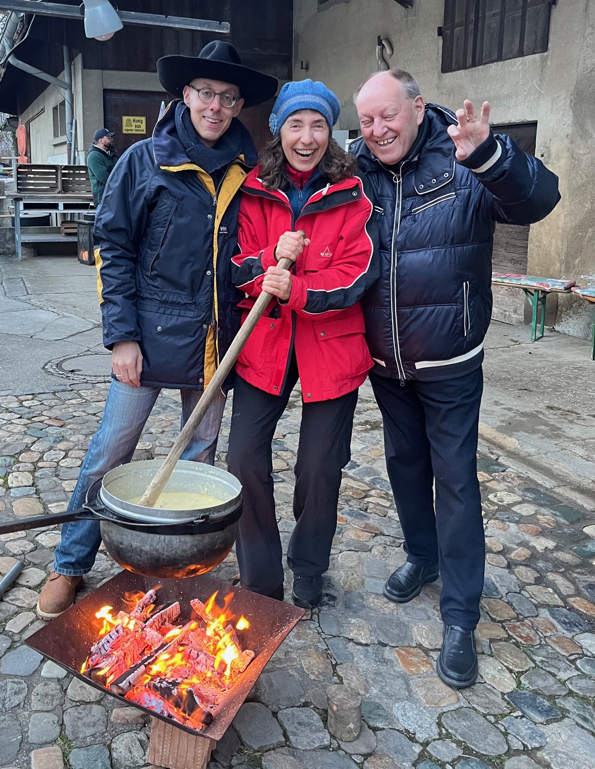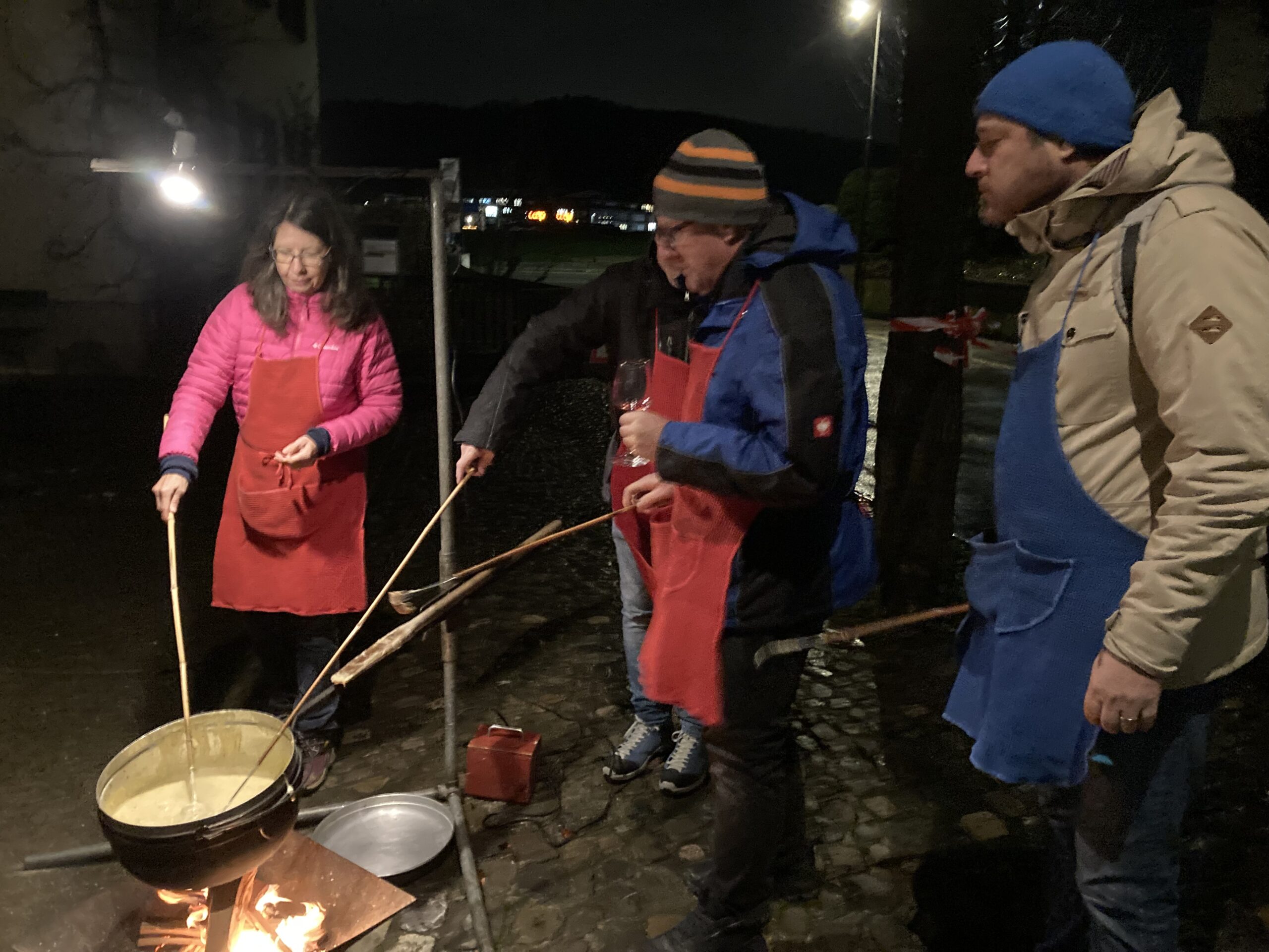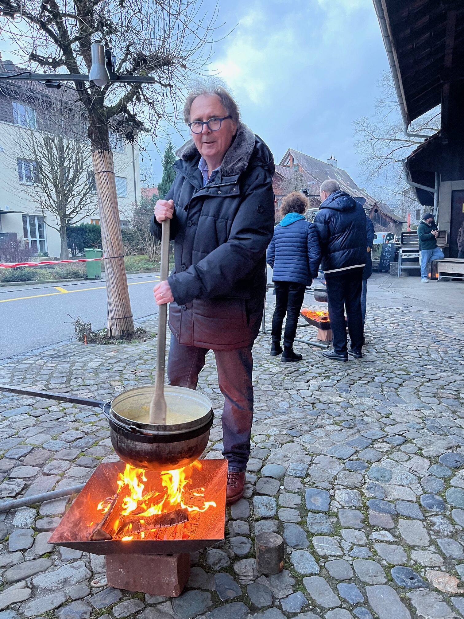 Mindestens für Stadtammann Markus Schneider und Stadtrat Philippe Ramseier war es der zweite Neujahrsapéro diese Woche: Am Montag hatten sie die Badenerinnen und Badener in's Trafo geladen, am Donnerstag waren sie bei den Dättwilerinnen und Dättwilern zu Gast und genossen vor dem Obrist-Hof genauso wie die rund 70 IG-Mitglieder das «Waldfondue» von Fritz und Ruedi (Käserei Kartause Ittingen). Gerade rechtzeitig hatte es zu winden und zu regnen aufgehört, sodass die vier Käsesuppen über dem offenen Feuer nicht nach Rauch, sondern nach Chili, Chnobli, Speck und Kräuter schmeckten. Herzlichen Dank seitens des IG-Vorstands bei der Familie Obrist sowie Alexandra Kessler und Gabriel vom Restaurant Atrium Täfernhof für die Bewirtung mit Getränken.