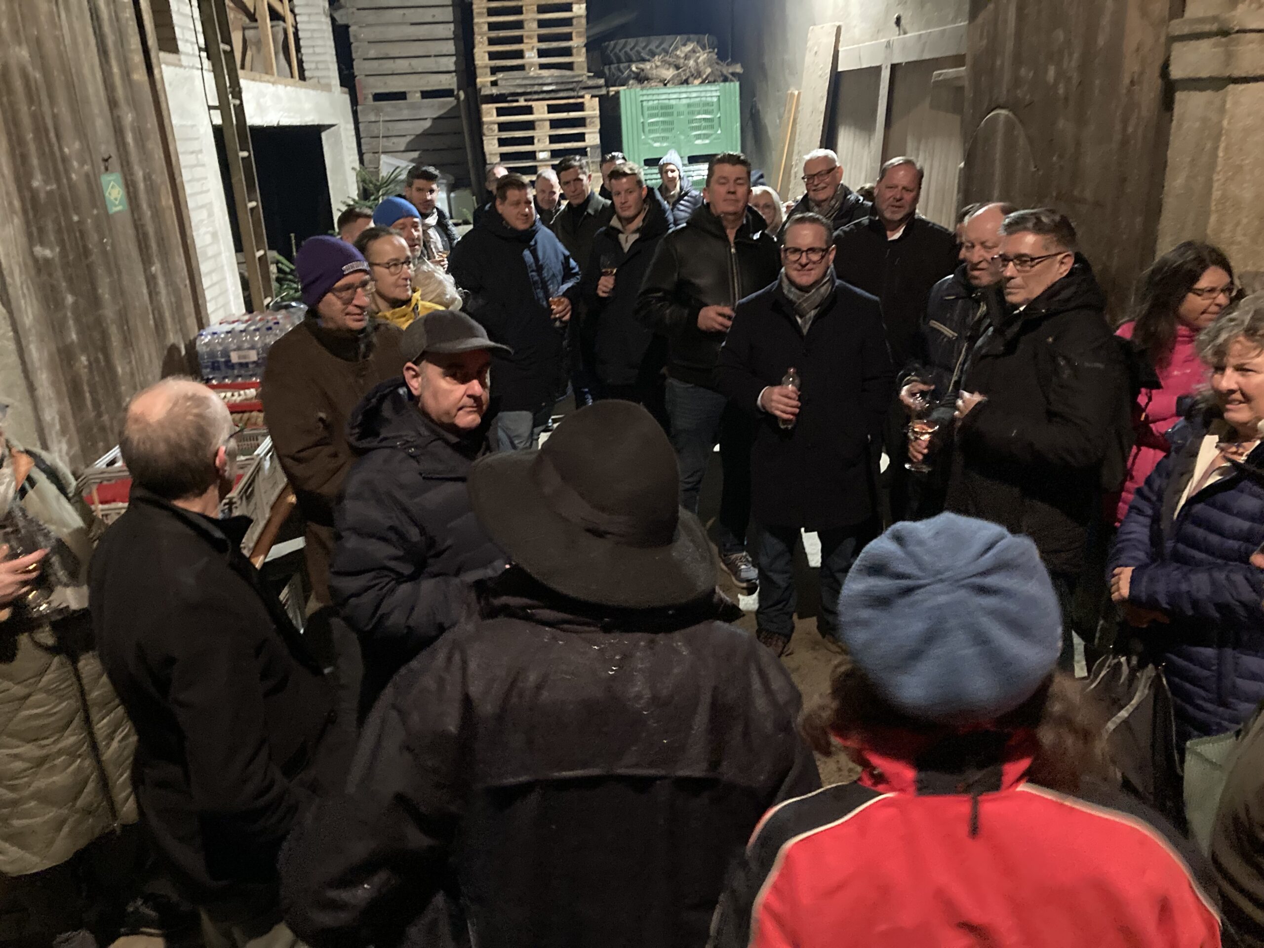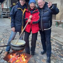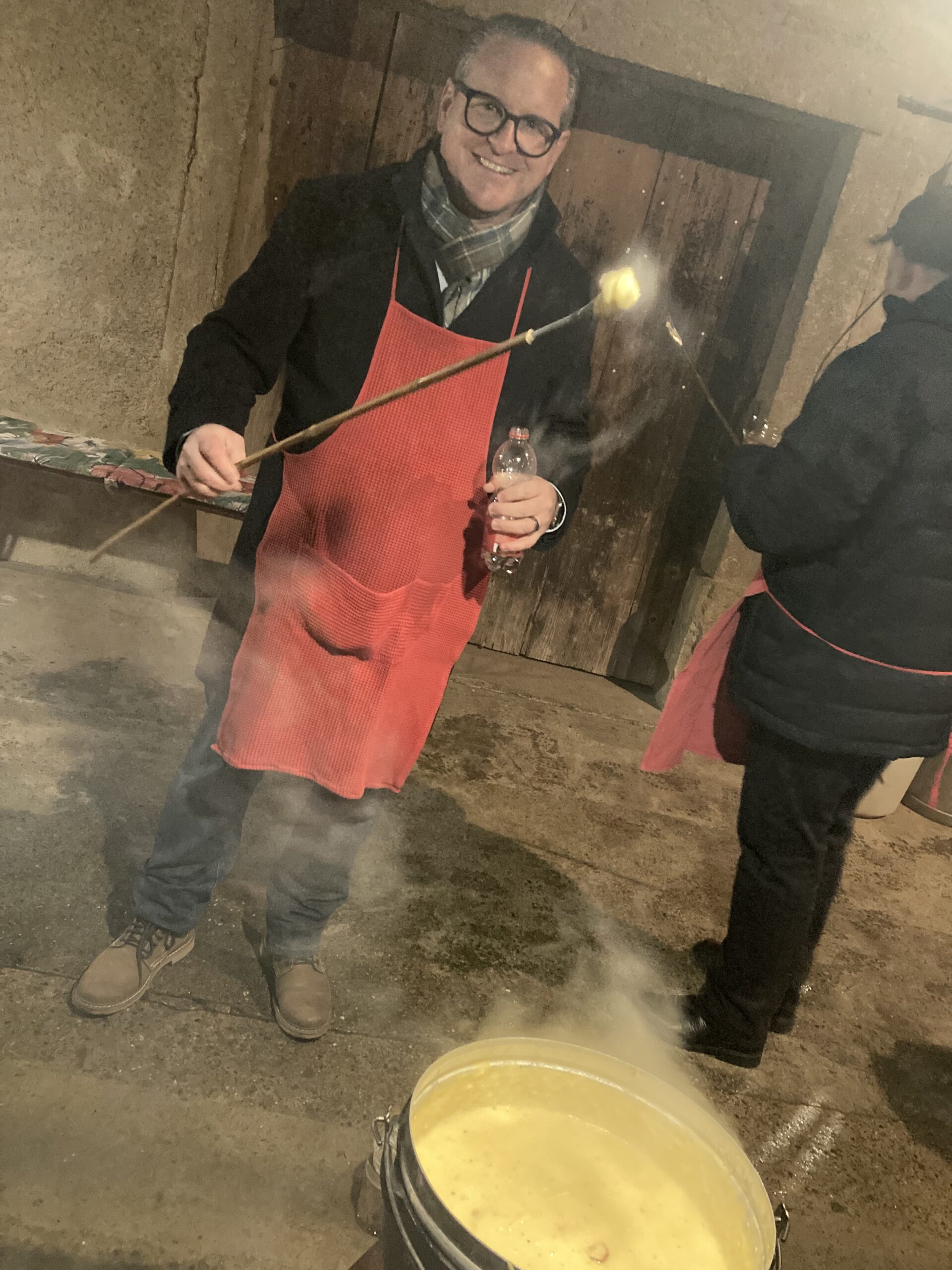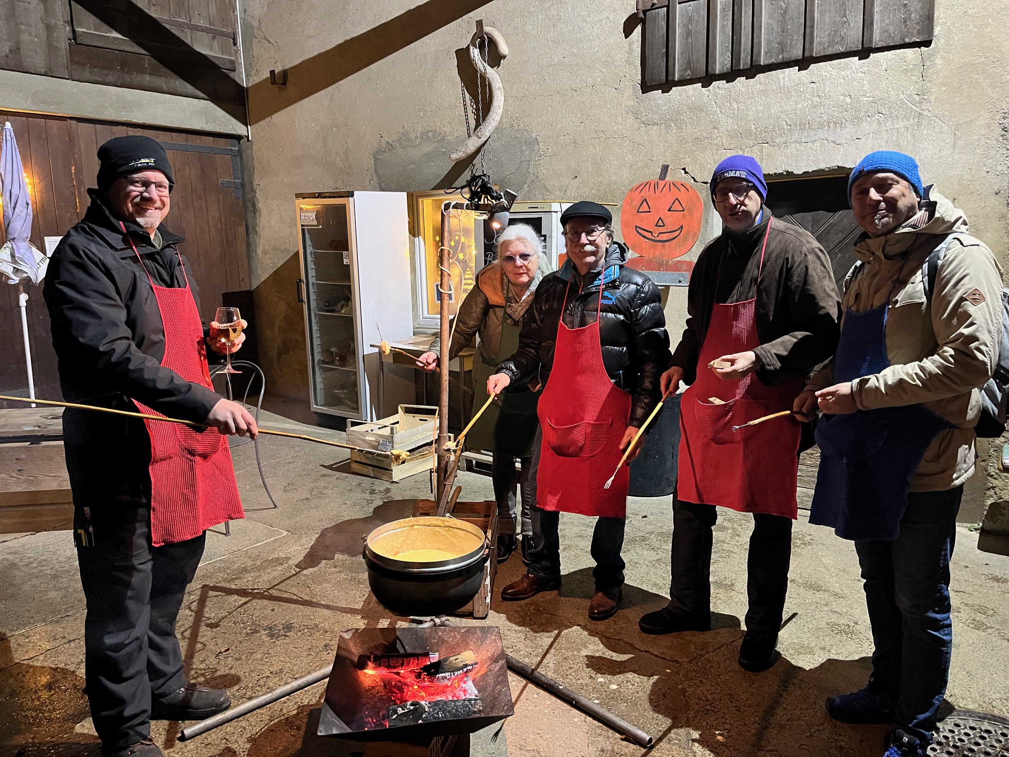Mindestens für Stadtammann Markus Schneider und Stadtrat Philippe Ramseier war es der zweite Neujahrsapéro diese Woche: Am Montag hatten sie die Badenerinnen und Badener in's Trafo geladen, am Donnerstag waren sie bei den Dättwilerinnen und Dättwilern zu Gast und genossen vor dem Obrist-Hof genauso wie die rund 70 IG-Mitglieder das «Waldfondue» von Fritz und Ruedi (Käserei Kartause Ittingen). Gerade rechtzeitig hatte es zu winden und zu regnen aufgehört, sodass die vier Käsesuppen über dem offenen Feuer nicht nach Rauch, sondern nach Chili, Chnobli, Speck und Kräuter schmeckten. Herzlichen Dank seitens des IG-Vorstands bei der Familie Obrist sowie Alexandra Kessler und Gabriel vom Restaurant Atrium Täfernhof für die Bewirtung mit Getränken.